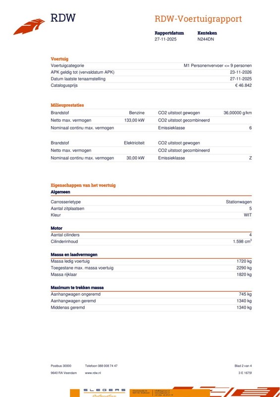 - Vermogen verbrandingsmotor: 133 kW