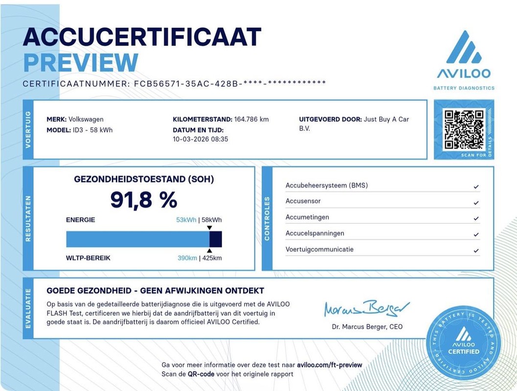Tevens worden al onze elektrische auto's afgeleverd met een gepatenteerde batterijtest, uitgevoerd door Aviloo. Dit biedt een snelle en betrouwbare manier om de prestatiewaarde van een tractiebatterij in een elektrisch voertuig te bepalen. Voor de test worden bepaalde parameters van de batterij gemeten.